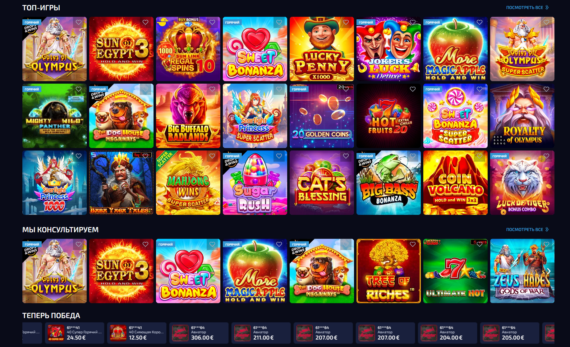 | Слоты | Классические и видеослоты, игры с фриспинами, множителями, бонусными раундами |